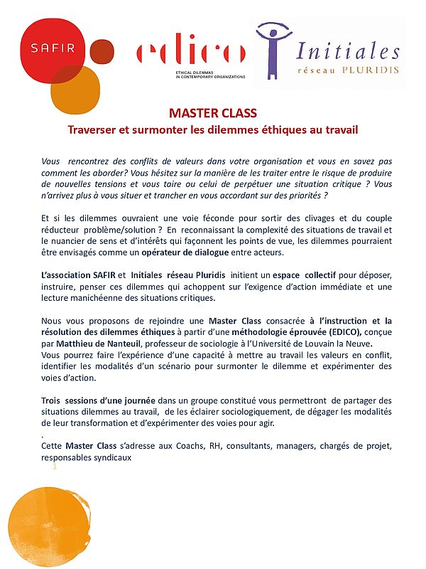 Ce dispositif inédit de Master Class est proposé en partenariat entre l’association SAFIR et Initiales, réseau Pluridis qui ont déjà une longue expérience de projets en coopération. Il est conçu comme un espace d’élaboration collective des situations dilemmes rencontrées dans le cadre professionnel. Il s‘appuie sur une méthode d’apprentissage (EDICO) développée par Matthieu de Nanteuil, professeur de sociologie à l’Université de Louvain la Neuve et spécialiste des questions éthiques dans le travail.